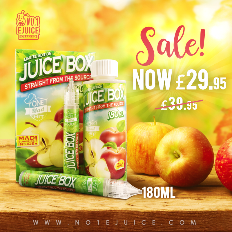 Voici le roi des jus de pomme est maintenant sur VENTE! 180ml de délicieuse langue poinçonnant la saveur de pomme rouge qui vapes parfaitement doux pour ceux qui ont une dent sucrée.