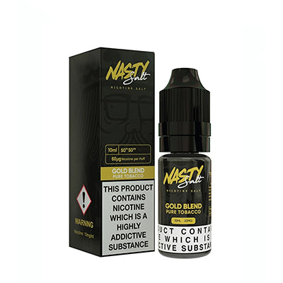 Gold Blend e-liquid by Nasty Salts is a tobacco blend with nutty undertones. A rich and robust tobacco provides the base of the taste, complemented by notes of sweet almond for a well-balanced vape.
