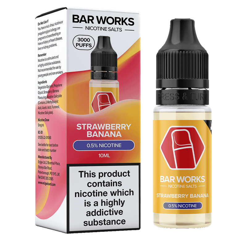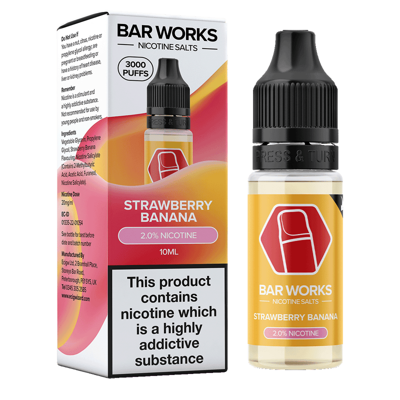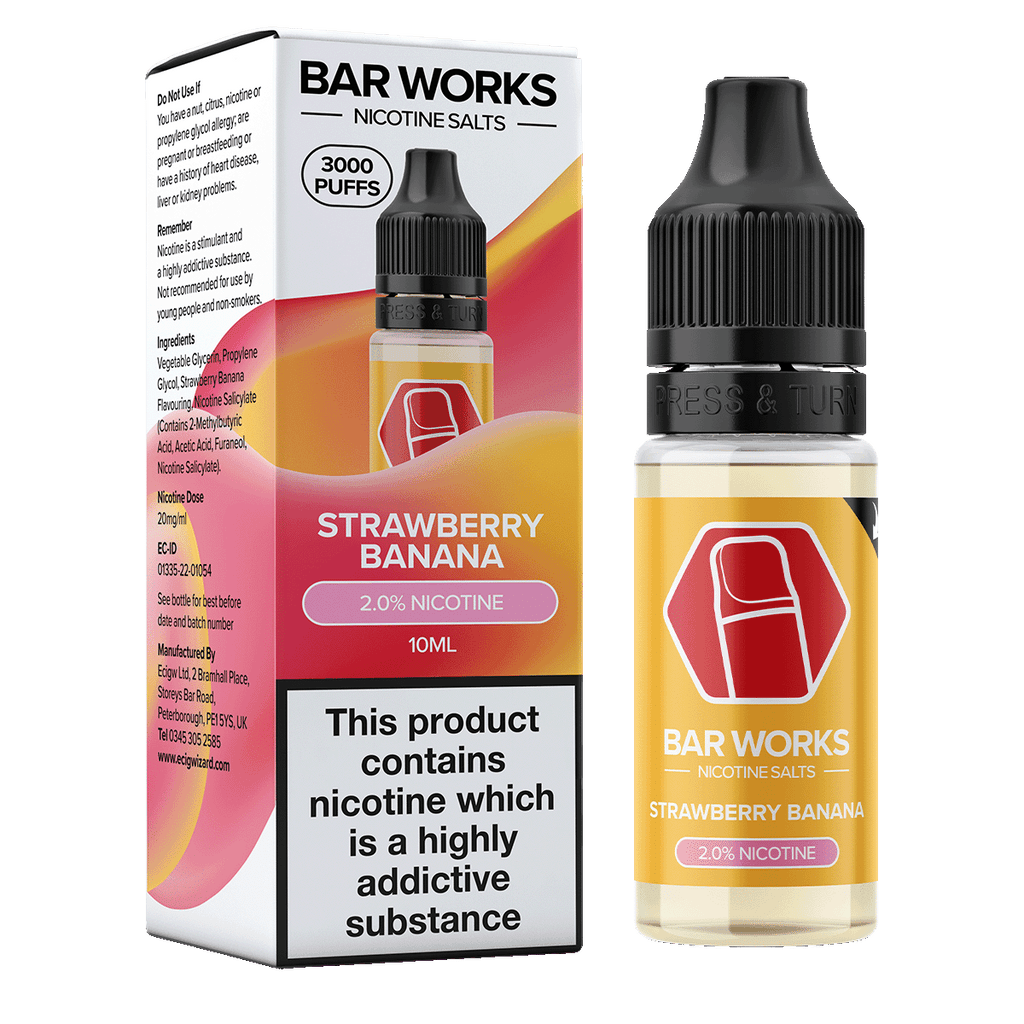 Introducing Strawberry Banana Nic Salt E-Liquid by Bar Works. Taste the refreshing mixed fruit notes of delicious summertime strawberries fused with creamy banana notes to provide the ultimate flavour experience.