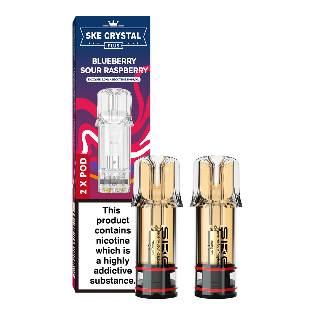 Blueberry Sour Raspberry SKE Crystal Plus Pods have a sweet and sour flavour profile. A mouthwatering sweet and sour fruit vape with such a rich, luscious blueberry inhale and tangy raspberries on the exhale.
